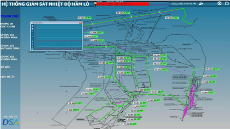- Dữ liệu nhiệt độ được thu thập và hiển thị tập trung tại phòng điều khiển trung tâm thông qua phần mềm WinCC, với giao diện trực quan bản đồ mỏ, các điểm đo, cảnh báo và đồ thị theo thời gian. Hệ thống cho phép cài đặt ngưỡng cảnh báo, theo dõi sự cố như đứt cáp quang, đồng thời hỗ trợ lưu trữ và xuất báo cáo dữ liệu lịch sử phục vụ công tác quản lý và phân tích.